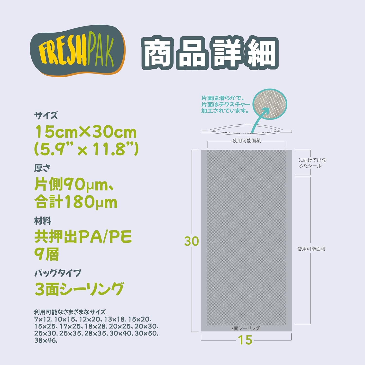 • 🟢 片面エンボス加工で脱気しやい ▶ 袋は片面エンボス加工で脱気しやすく、特別的なチャネルで最大限に空気を取り除くことができ、フィルムが5層構造になり密閉性が非常に強いです。もう一方は滑らかで透明で中身がよく見えます。ほぼ各家庭用真空パック機対応。